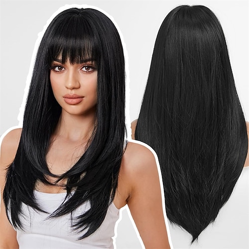 lange glatte Perücken für Frauen mit Pony, geschichtete synthetische Aschblondperücken mit dunklen Wurzeln für Frauen
