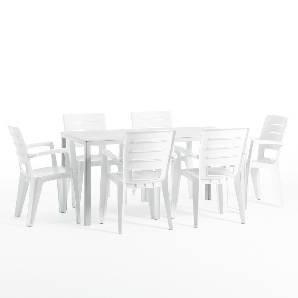 RATTATAN Gartenset mit Tisch und 6 Stühlen, rechteckiger Tisch mit Stahlgestell und stapelbaren Stühlen aus Harz mit Armlehnen –Thomas+Anita/Weiß