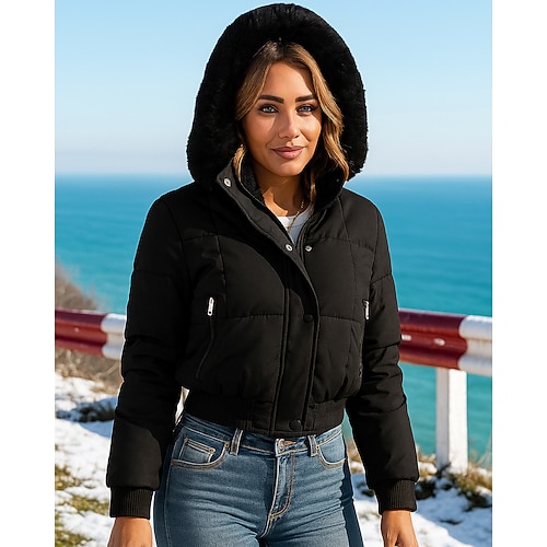 Per donna Giacca con cappuccio di pelliccia Cappotto invernale corto Giacca in Pile con tasche Manica Lunga Top Athleisure Inverno Tinta unita Antivento Caldo Escursionismo Viaggio Vacanze