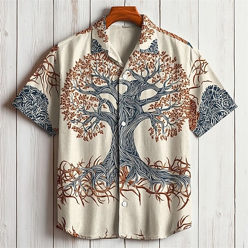 Herren Baum des Lebens Hemd Sommerhemd Freizeithemd Kurze Ärmel Hawaiianisch Lässig Resort Urlaub Alltagskleidung Ausgehen Sommer Revers Druck Dunkel Braun Braun Khaki
