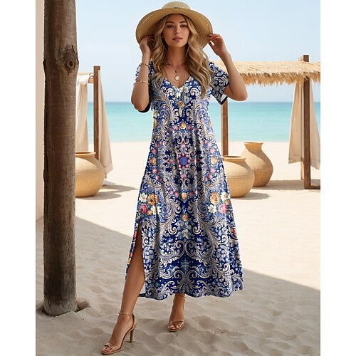 Per donna Abito maxi Abito Boho Vestito Estivo Vestito Casual Abito Etnico Elegante Bohemien Vacanza Spiaggia Ferie Data Vestibilità comoda Floreale Grafico Boho Paisley Damasco Senza Maniche Scollo