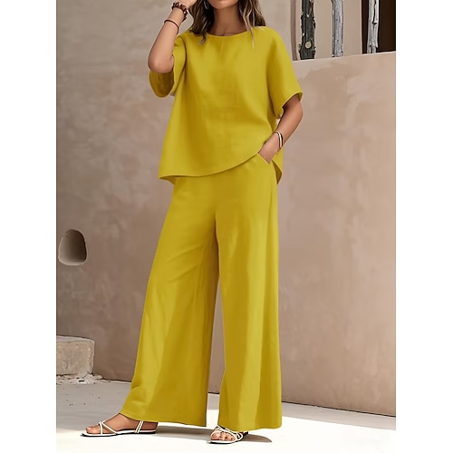 Per donna Set di Pantaloni Finto cotone e lino Manica Corta Girocollo Tinta unica Moda Streetwear Casuale Quotidiano All'aperto Blu Nero Giallo Estate Vestibilità comoda