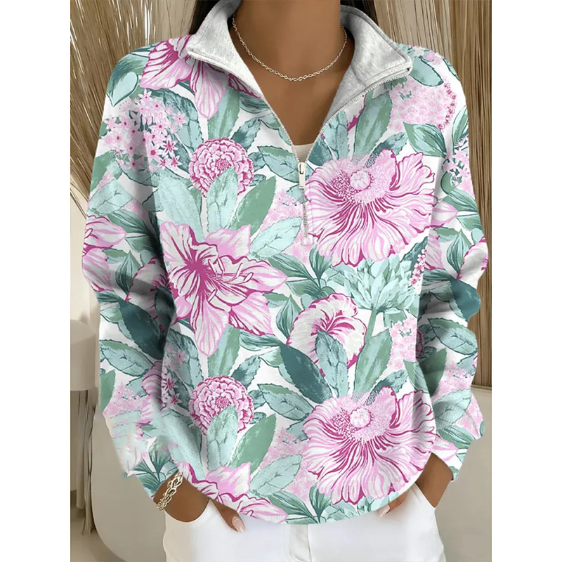 Women's Pullover Sweatshirt Floral Graphic Casual Long Sleeve Half Zip Regular Tops Casual Dailywear Holiday Zipper Pink Green Beige Spring Fall