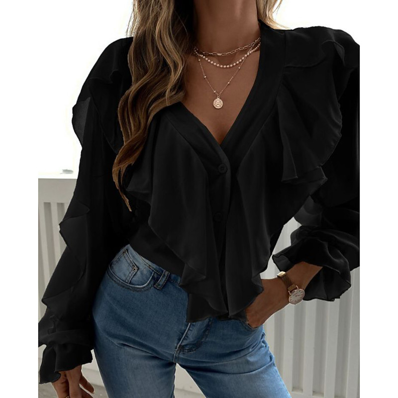 Women's Blouse Solid Color Daily Ladies Stylish Long Sleeve V Neck Regular Tops Daily Ruffle Black White Spring Fall