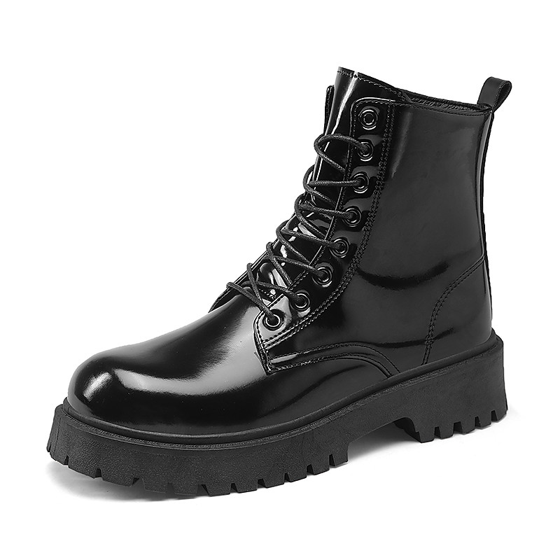Women's White Lace Up Combat Boots, Classic Casual Preppy Faux Leather Patent Leather Mid Calf Boots for Office, Casual Wear and Outdoor Activities