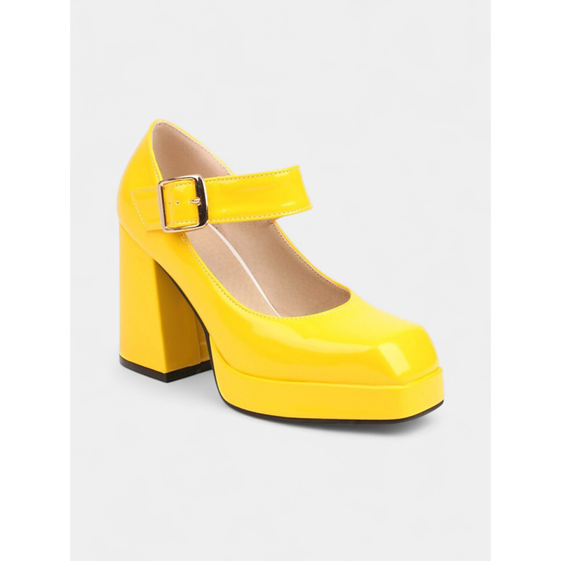 Women's Red Patent Faux Leather Platform Heels – Chunky High Heels with Buckle Strap, 1980s Bold Retro Style for Parties, Formal Events and Christmas