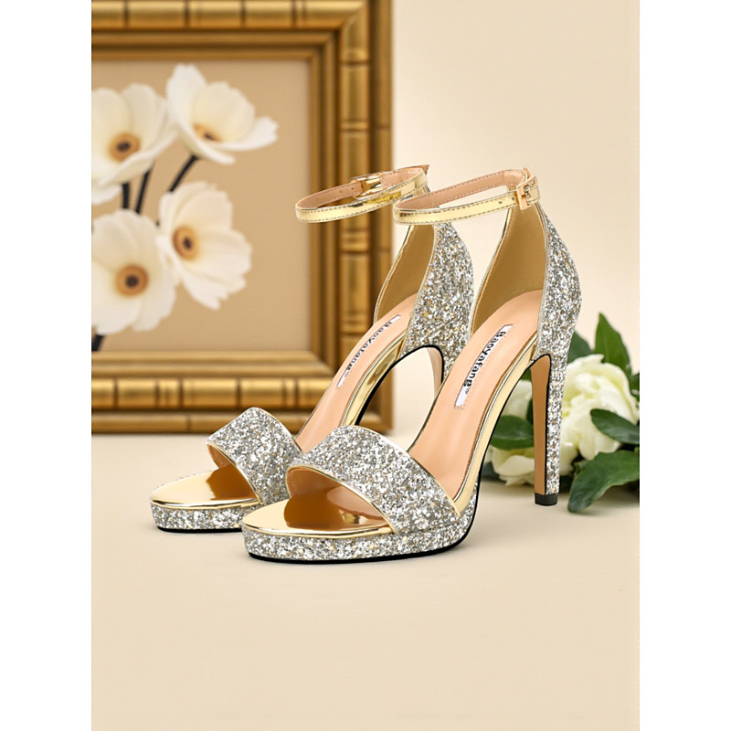 Women's Silver Glitter High Heel Sandals with Ankle Strap, Sparkly Nightlife Party Shoes for Club and Evening Outfits