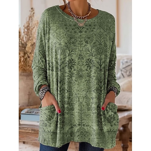 Per donna Maglietta Floreale Grafico Piante Vintage Moda Elegante Manica Lunga Girocollo Top Regolari Quotidiano Uscire Weekend Tasca Stampato Blu Rosso Viola Verde Cachi Primavera Autunno Inverno