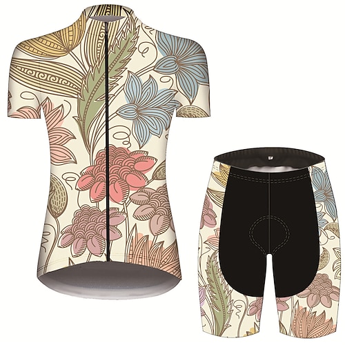 Damen Radtrikot mit Shorts Kurzarm Mountainbike MTB Straßenradsport Schwarz gelb Blatt Blumenmuster Fahhrad 3D-Polster Schnelltrocknend UV-beständig Atmungsaktiv Spandex Sport Bekleidung