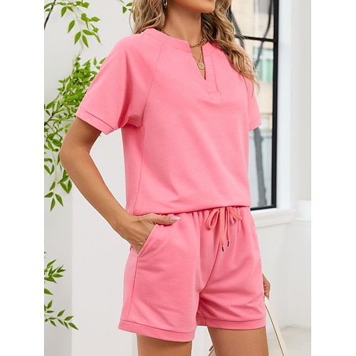 Per donna Set di Pantaloncini Manica Corta Scollo a V Tinta unica Moda Streetwear Casuale Quotidiano All'aperto Nero Bianco Rosa Estate Vestibilità regolare