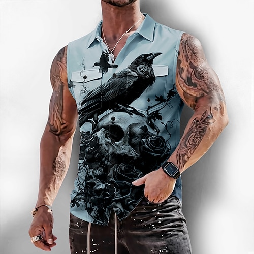 Herren Schädel Krähe Raven Hemd Knopfhemd Ärmelloses Shirt Ärmellos Dunkler Gothic-Stil Outdoor Lässig Sommer Frühling Umlegekragen 3D-Druck Zwei Fronttaschen Blau Weiß Purpur Khaki