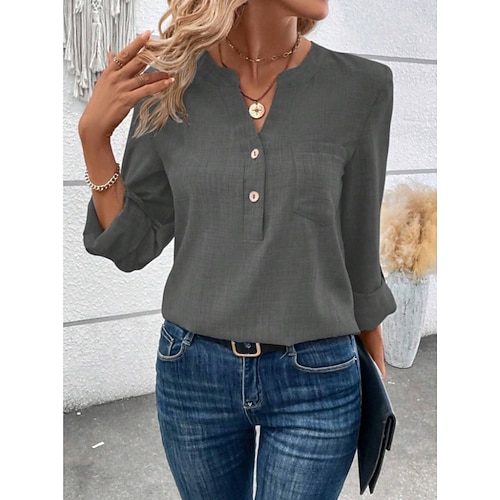 Per donna Camicia Tinta unica Elegante Casual Manica Lunga Scollo a V Top Regolari Quotidiano Bottoni Rosso Blu Grigio Estate Primavera Autunno