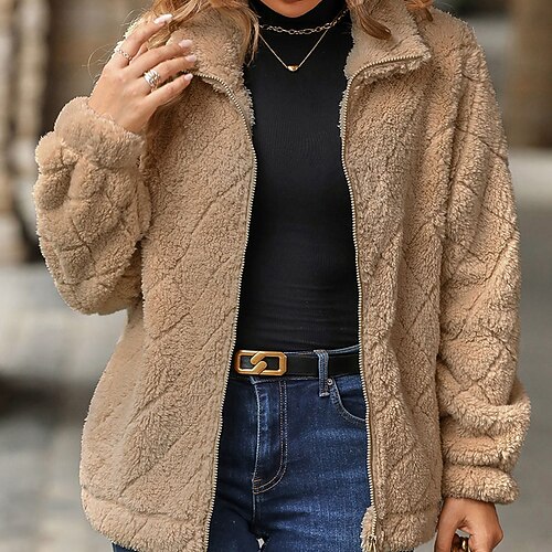 Per donna Cappotto Invernale Cappotto Teddy Caldo Confortevole Cerniera Tasca Casual Tinta unica Casuale Vacanza Streetwear Abbigliamento quotidiano Regolare Collo ripiegato Vestibilità regolare