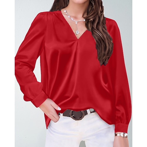 Per donna Camicia Elegant Elegante Raso/Satin Semplice Moderno Casual Manica Lunga Scollo a V Top Regolari Quotidiano Ferie Uscire Arricciato Nero Bianco Giallo Rosa Vino Autunno