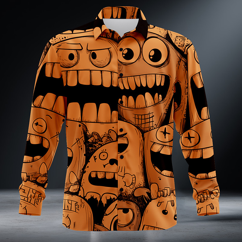 Men's Cartoon Funny Smile Face Shirt Button Up Shirt Long Sleeve Vintage Retro Outdoor Holiday Summer Spring Turndown 3D Print Collared Shirts Dark Green Orange Dark Blue Gray