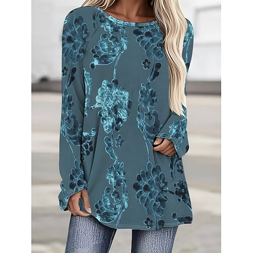 Damen T Shirt Blumen Grafik Geometrisch Vintage Stilvoll Klassisch Langarm Rundhalsausschnitt Rundhals Lange Oberteile Täglich Druck Blau Purpur Frühling Herbst