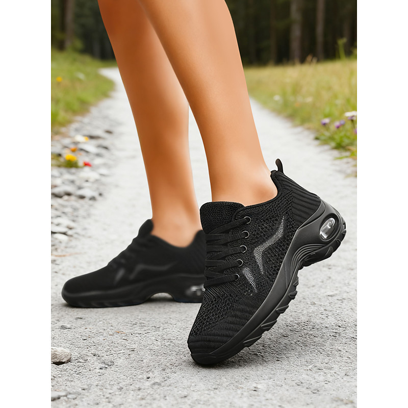 Women's Black Knit Dance Sneakers – Breathable Mesh Lace-Up Jazz Shoes with Air Cushion Sole for Fitness, Hip-Hop Latin Dance