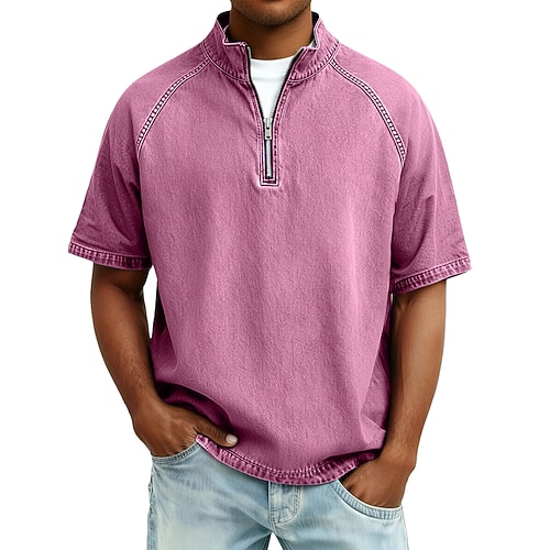Da uomo Camicia 100% cotone lavaggio acido Maglietta Manica Corta Collo alla coreana Primavera Autunno Autunno Inverno Semplice Vintage Streetwear Casual Con zip Base Casuale Casa Streetwear Blu