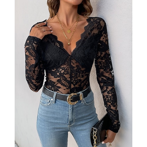 Per donna Body Streetwear Tinta unica Manica Lunga Scollo a V Pizzo Vacanza Feste Vestibilità regolare Nero Bianco Estate