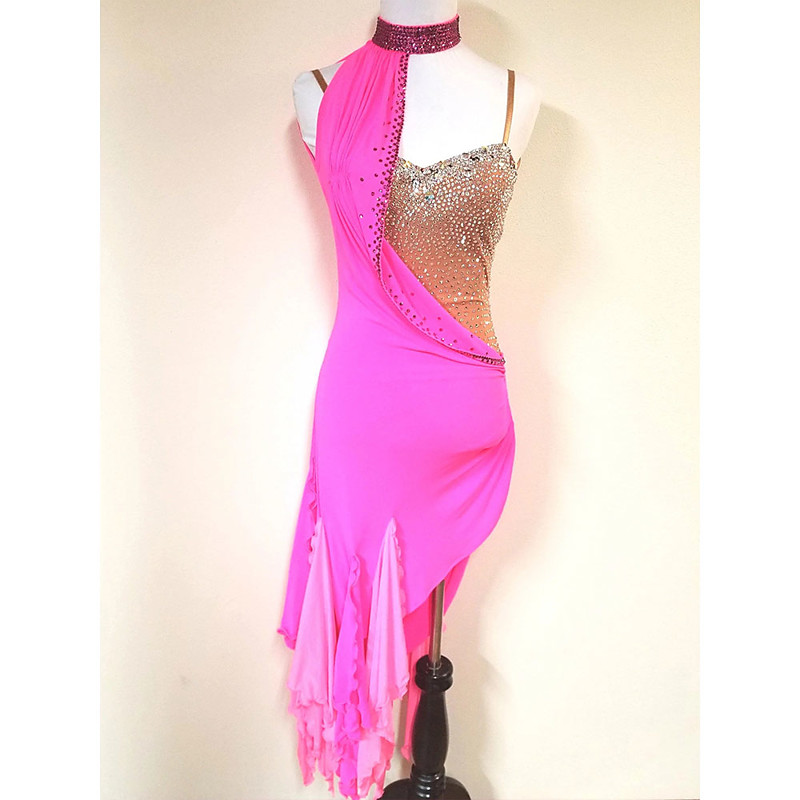 Women's Pink Latin Dance Dress with Crystal Rhinestones, Fringe Detail for Salsa, Tango, and Performance Wear