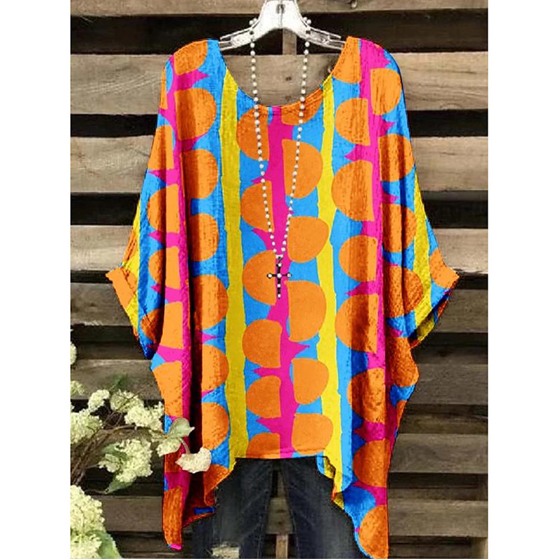 Women's Boho Shirt Graphic Geometric Elegant Bohemia Vintage Short Sleeve Batwing Sleeve Crew Neck Regular Tops Daily Holiday Beach Wear Print Denim Blue Light Brown Blue Orange Rainbow Summer Spring