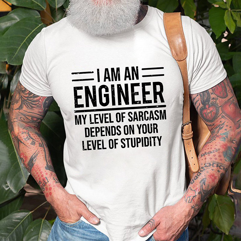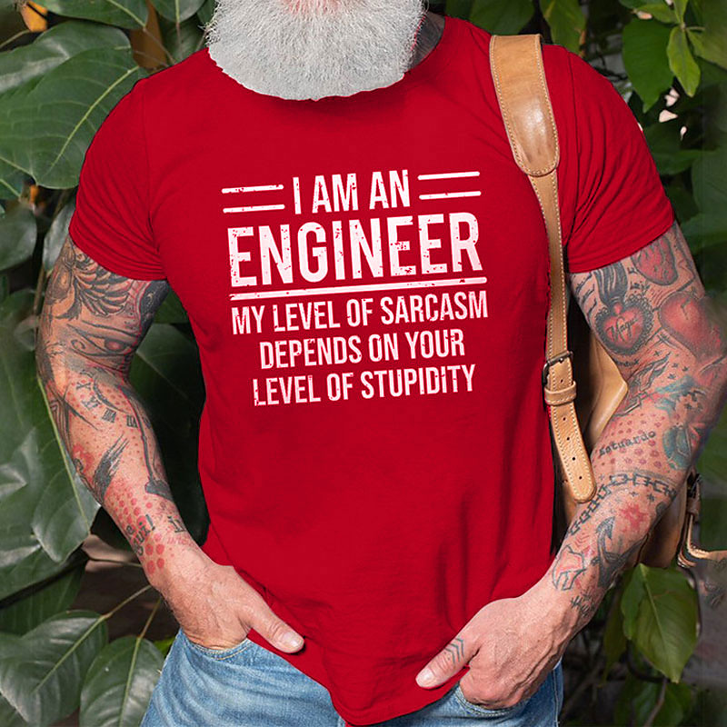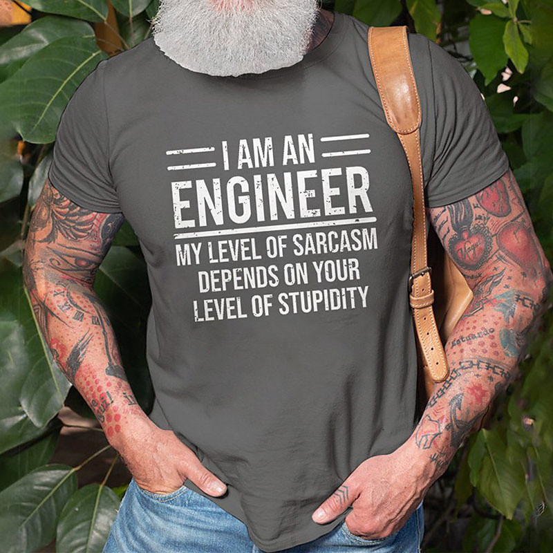 Mens Engineer Graphic T-Shirt, Funny Sarcasm Level Depends on Stupidity Work Humor Short Sleeve Tee