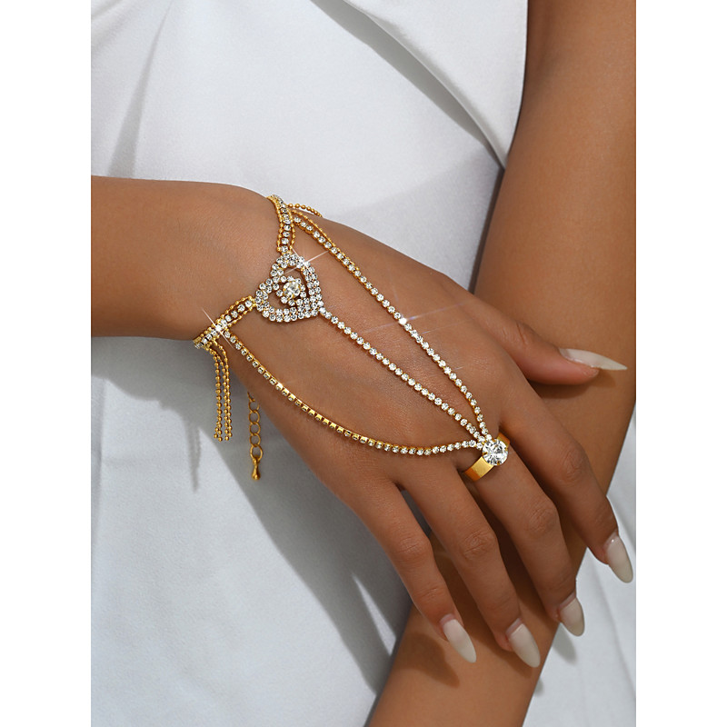 Women's Gold Rhinestone Heart Hand Chain Bracelet - Elegant Crystal Ring Bracelet Combo for Party, Wedding and Evening Occasions