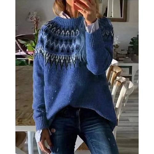 Damen Weihnachtspullover Fair Isle Pullover Pullover Fair Isle Sweater Streetwear Lässig Geometrisch Rundhalsausschnitt Gestrickt Druck Langarm Normale Oberteile Stricken Täglich Ferien Ausgehen