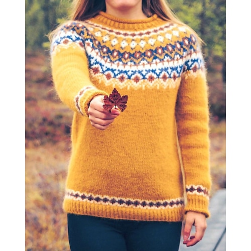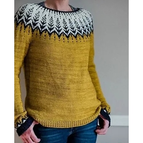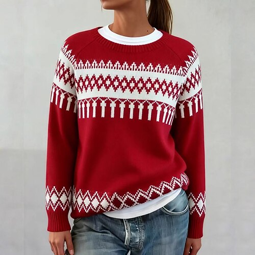 Damen Weihnachtspullover Fair Isle Pullover Pullover Fair Isle Sweater Streetwear Lässig Geometrisch Gerippt Rundhalsausschnitt Gestrickt Langarm Normale Oberteile Stricken Outdoor Täglich Wochenende