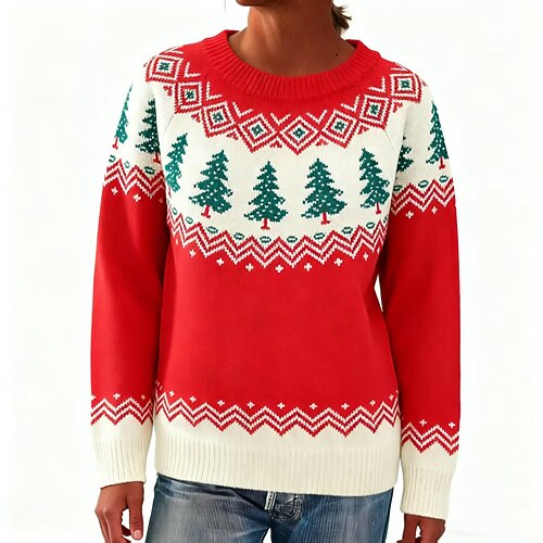 Damen Weihnachtspullover Fair Isle Pullover Pullover Fair Isle Sweater Streetwear Lässig Blumen Weihnachtsbaum Rundhalsausschnitt Gestrickt Druck Langarm Normale Oberteile Stricken Weihnachten Ferien