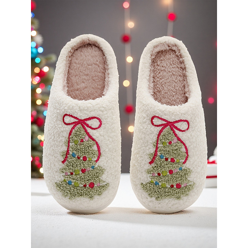 Women's White Christmas Tree Slippers with Plush Lining, Cozy Winter House Shoes for Holiday Party Gift Giving