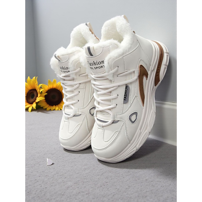 Women's White Warm High-Top Sneakers with Faux Fur Lining - Trendy Chunky Sole Winter Shoes for Casual Outdoor Wear