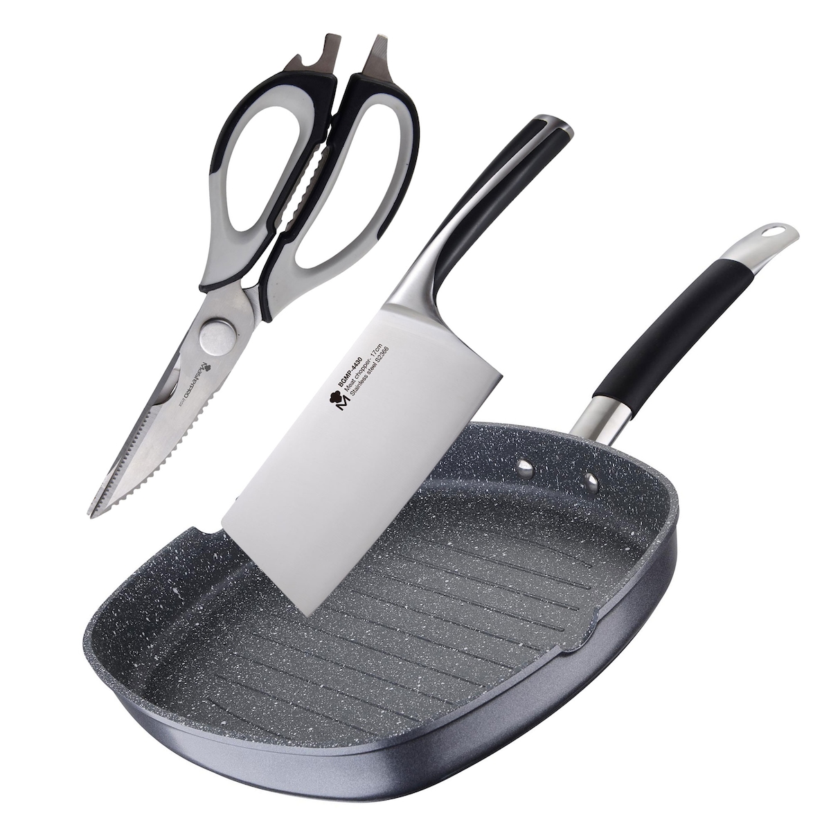 Masterpro - Grillpfanne 28x28x4,5 cm aus geschmiedetem Aluminium, Machetenmesser 17,5 cm und Schere 23 cm aus Edelstahl