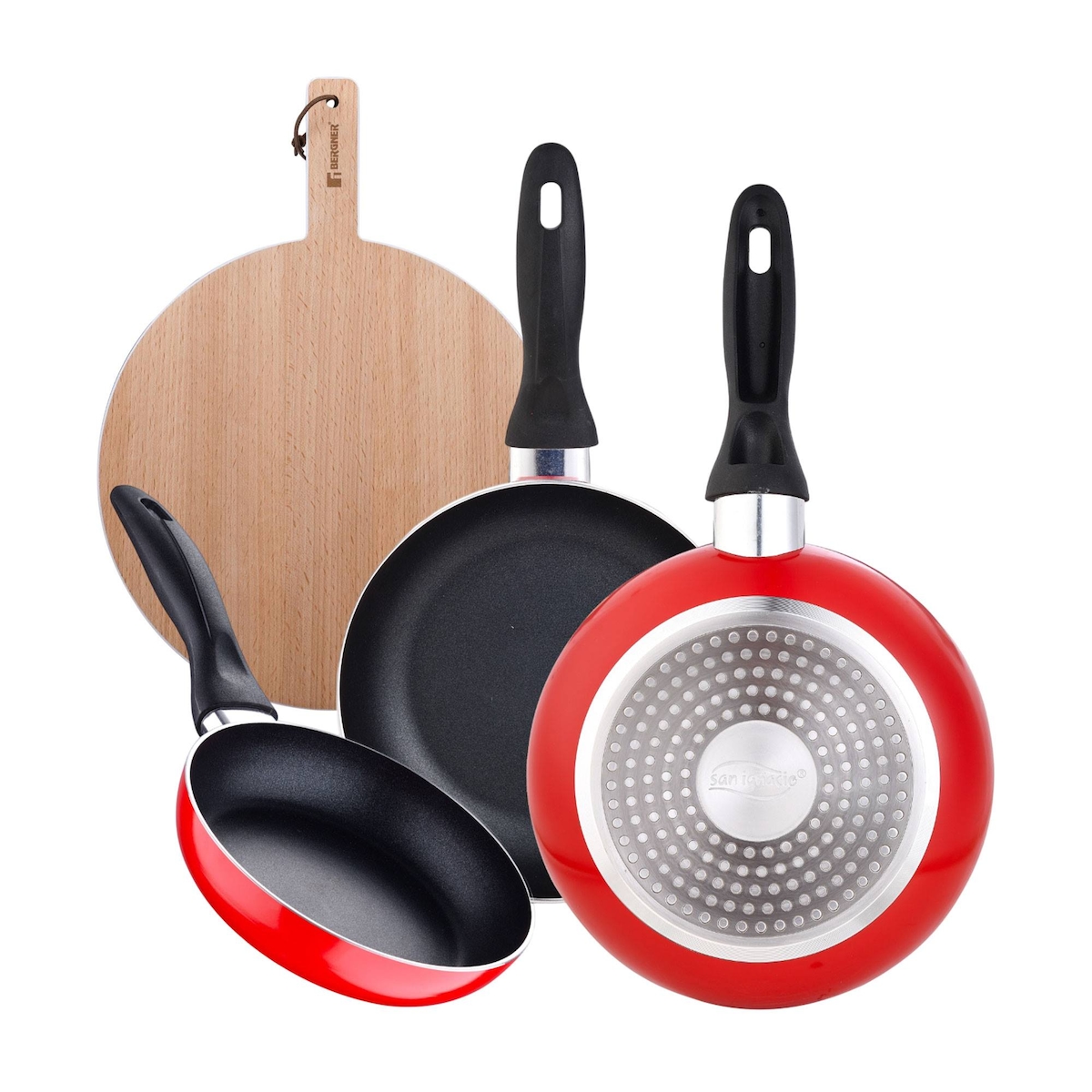 BERGNER - Set aus 3 Pfannen Ø16/Ø20/Ø24 cm aus gepresstem Aluminium, geeignet für Induktion Navy Red Rundes Schneidebrett 38x28x1,5 cm aus Buchenholz