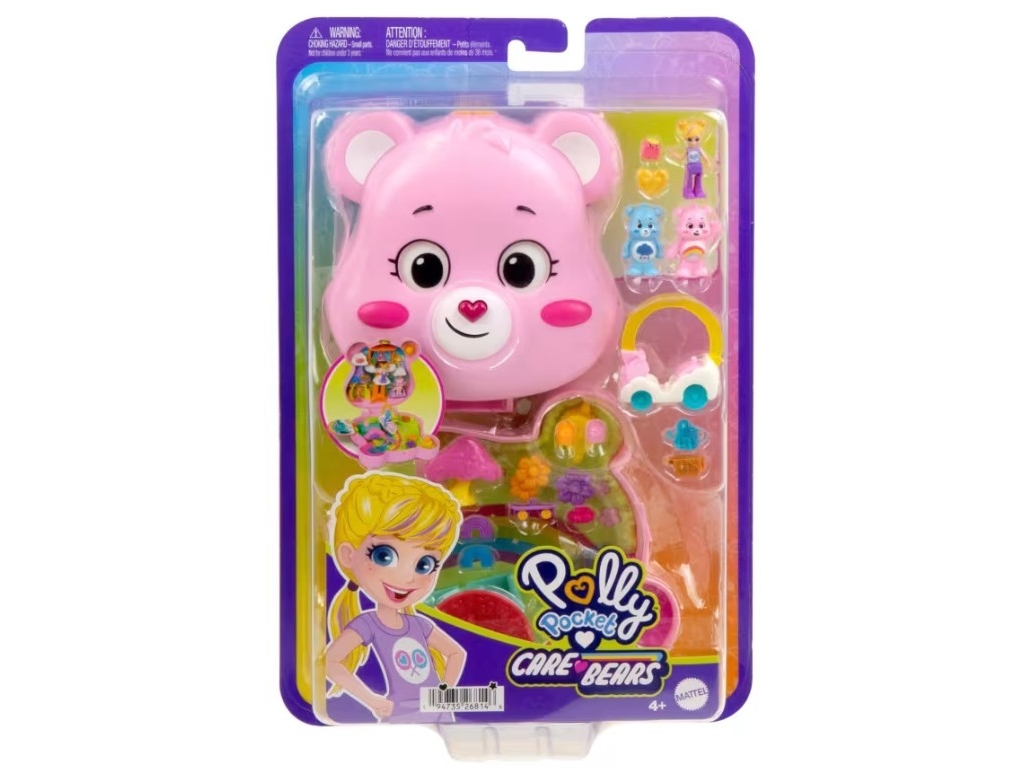 Polly Pocket x Glücksbärchi Puppen & Spielset mit Spielzeugauto und thematischen Accessoires, Reisespielzeug-Schatulle