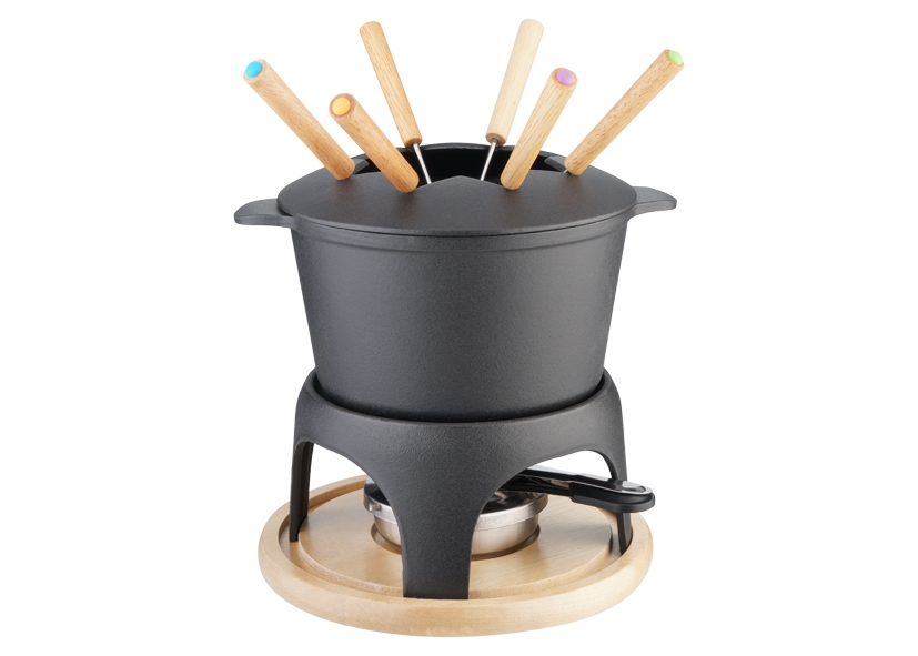 Eva 12-tlg Fondueset Gusseisen+Unterteller Birkenholz