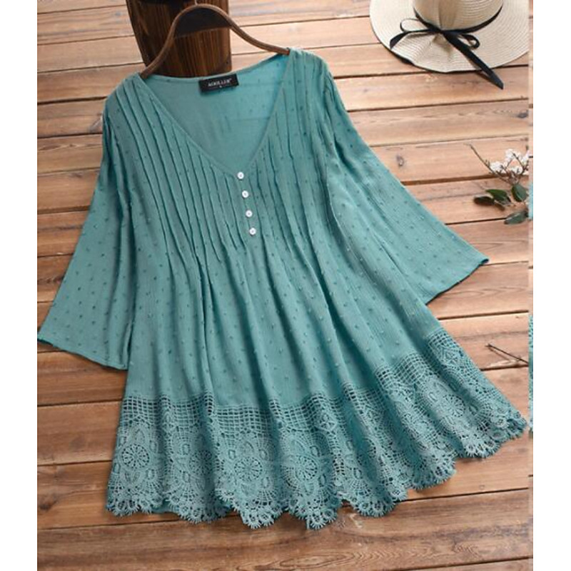 Women's Shirt Lace Shirt Blouse Eyelet top Pure Color Basic Casual 3/4 Length Sleeve V Neck Regular Tops Daily Lace Buttons White Pink Green Dark Blue Summer Spring Fall