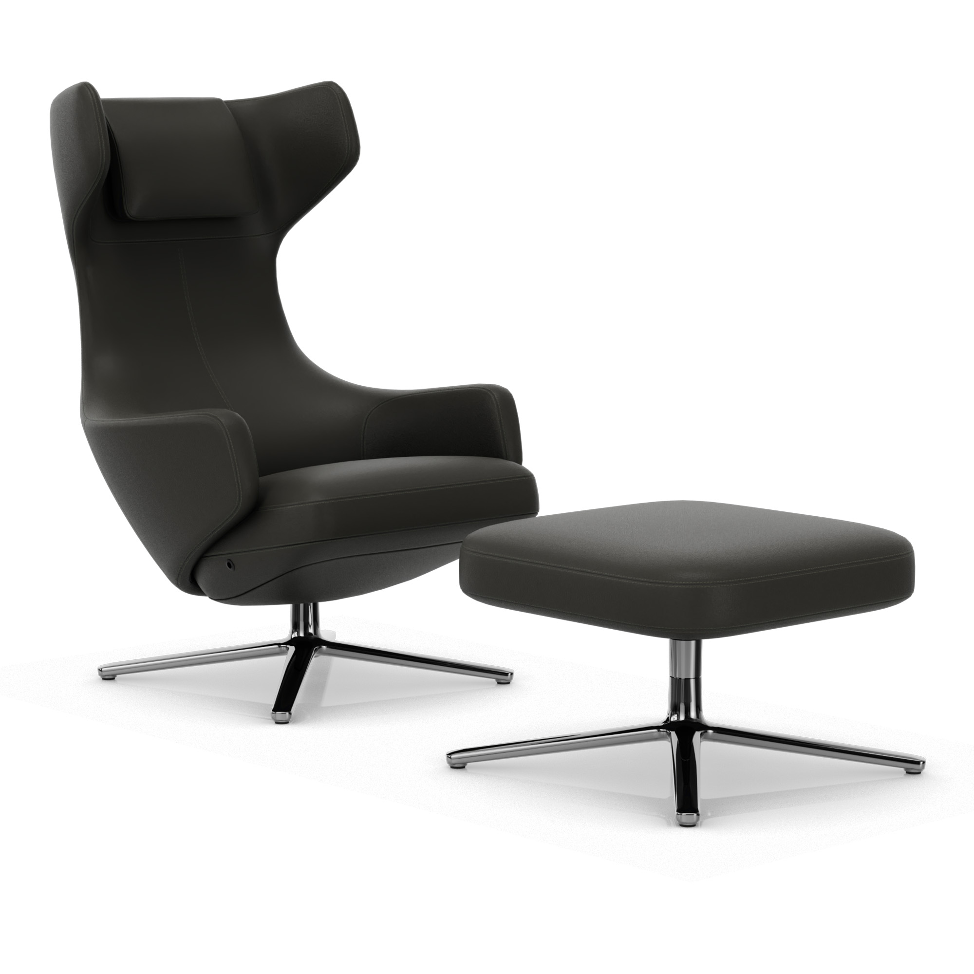 Vitra - Grand Repos & Ottoman Low, Aluminium Polished Base, Back/Seat Leather Premium L40 Umbra Grey - Fåtöljer - Antonio Citterio - Grå - Dun/Läder/Metall/Skum/Plast
