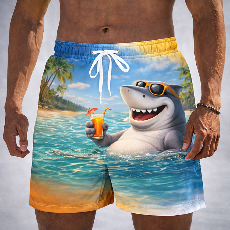 Men's Seawater Cartoon Hand Print Lined Shorts 2 in 1 Board Shorts Swim Shorts Mid Waist Hawaiian Holiday Beach Wear Side Pockets With Compression Liner Elastic Drawstring Waist Designer Clothing