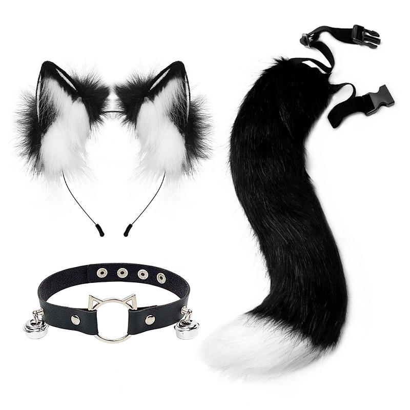 Cute Cat Ears Headband with Furry Tail and Collar Set – Animal Cosplay Accessories, Cat Girl Costume for Halloween, Party, and Performance