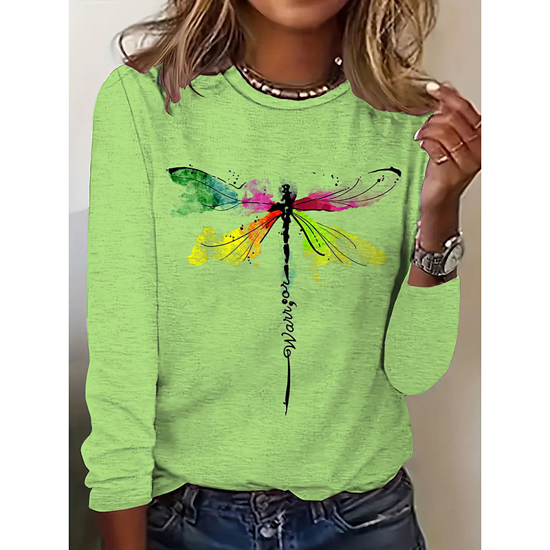 Women's T Shirt Graphic Dragonfly Vintage Stylish Classic Long Sleeve Crew Neck Regular Tops Daily Print Pink Blue Green Spring Fall Winter