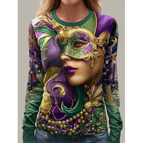 Maglietta da donna Carnival Graphic Fashion Casual a maniche lunghe colletto rotondo top regolari stampa quotidiana fine settimana blu nero viola estate primavera autunno