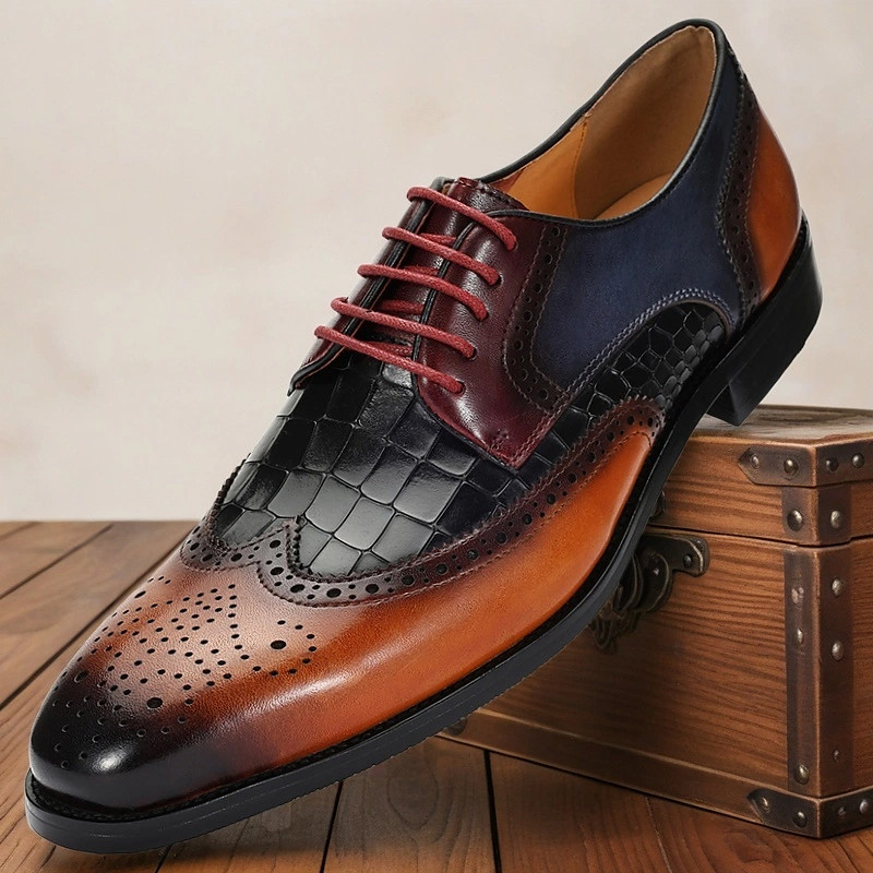 Men's Wingtip Brogue Genuine Leather Dress Shoes – Dual-tone Crocodile Embossed Lace-up Style for Banquets, Vintage Fashion and Evening Parties