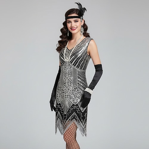Set Anni Ruggenti Anni 1920 Abito da cocktail Mini Abito Flapper Vestito Abiti con accessori Senza maniche Il grande Gatsby Taglie Forti Invitato al matrimonio Scollo a V Costume Per donna Carnevale
