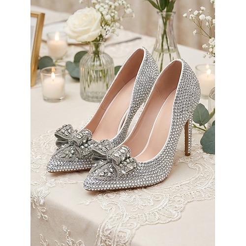 Scarpe con tacco alto a punta in cristallo argentato da donna, eleganti décolleté da sposa per spose da matrimonio in città