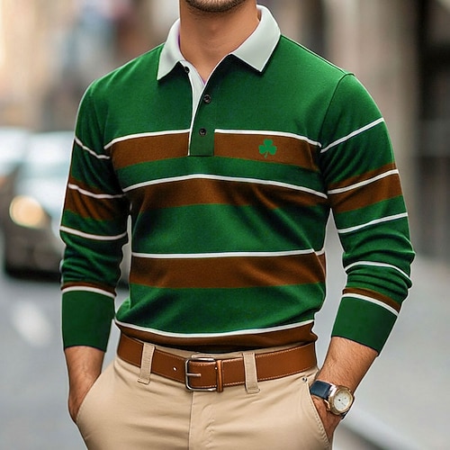 Polo rugby a righe orizzontali con trifoglio St. Patrick da uomo polo a maniche lunghe camicie colletto sportswear casual outdoor scuola athleisure stampa 3D primavera autunno verde 1 verde 2#