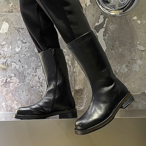 stivali alti fino al ginocchio da donna in similpelle nera con cerniera e fibbia decorativa: eleganti stivali invernali con tacco medio per outfit casual, da lavoro e da vacanza