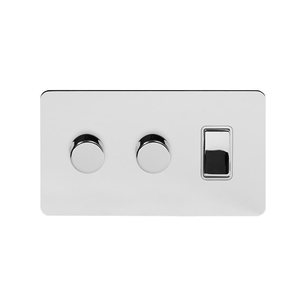 Soho Lighting Polished Chrome Flat Plate 3 Gang Dimmer and Rocker Switch Combo (2 x 2-Way Intelligent Dimmer & 1 x 2-Way Switch) - Size: 86mm x 146mm
