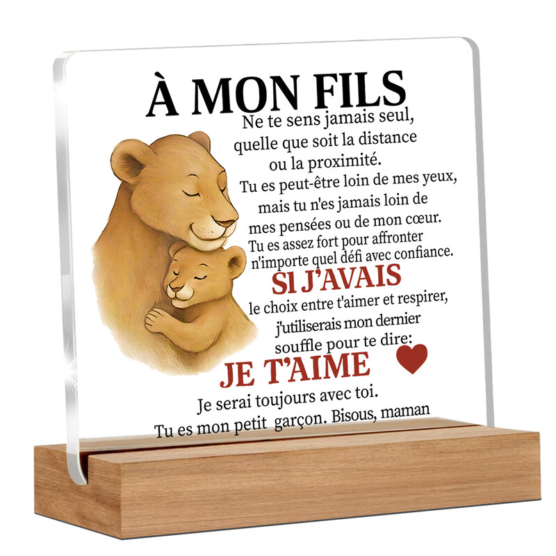 Alphynix Plaque Mère et Fils "À MON FILS" en acrylique, cadeau avec motif de lionne et de lionceau, "SI J'AVAIS...JE T'AIME" en lettres rouges sur base en bois, souvenir émouvant pour une relation à distance, 1 pièce