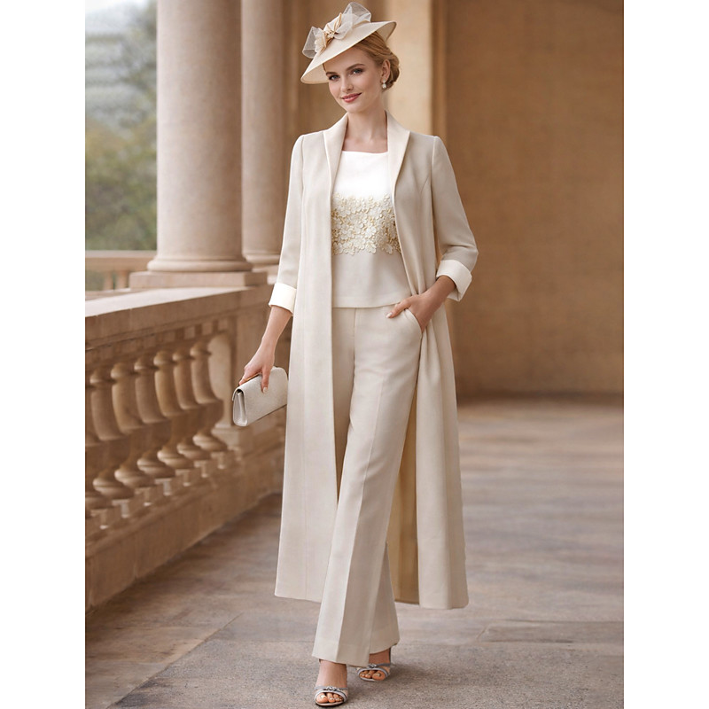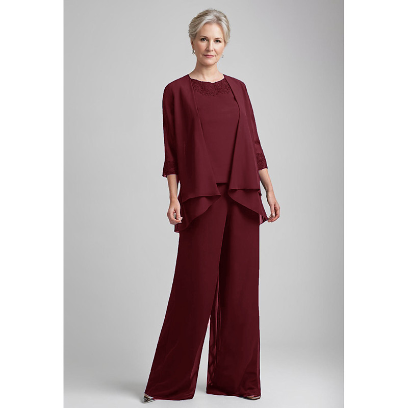 Jumpsuit Pantsuit 3 Piece Floor Length Mother of the Bride Dress 3/4 Length Sleeve Scoop Neck Elegant Formal Wedding Guest Lace Stretch Fabric Wrap Included with Appliques
